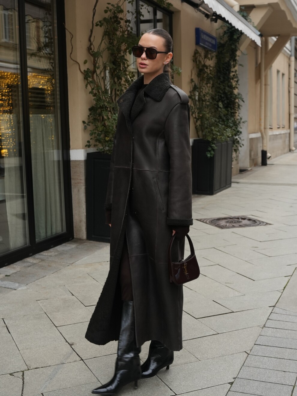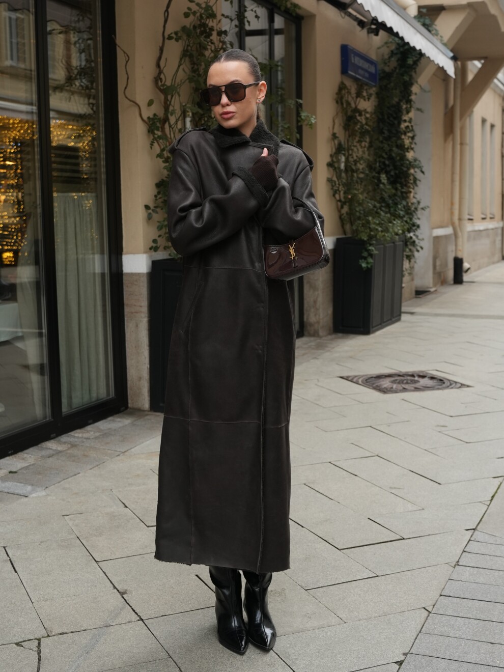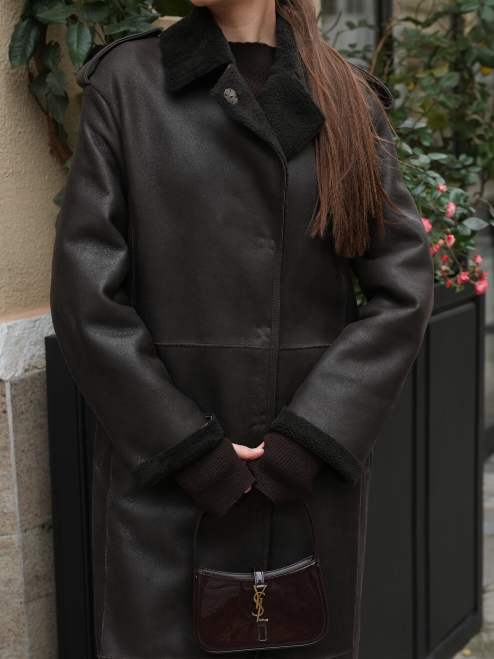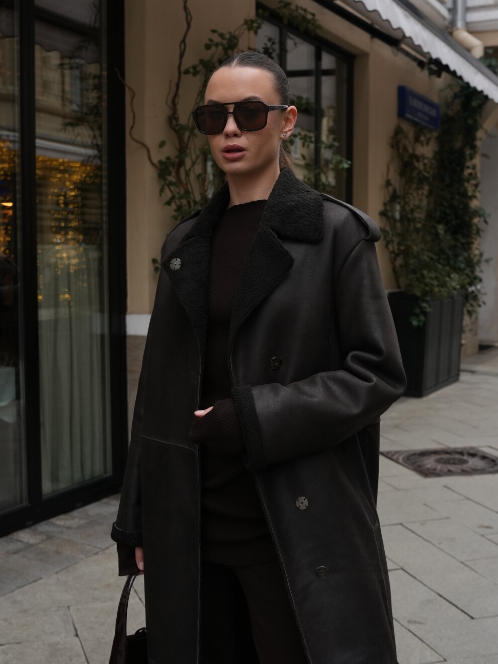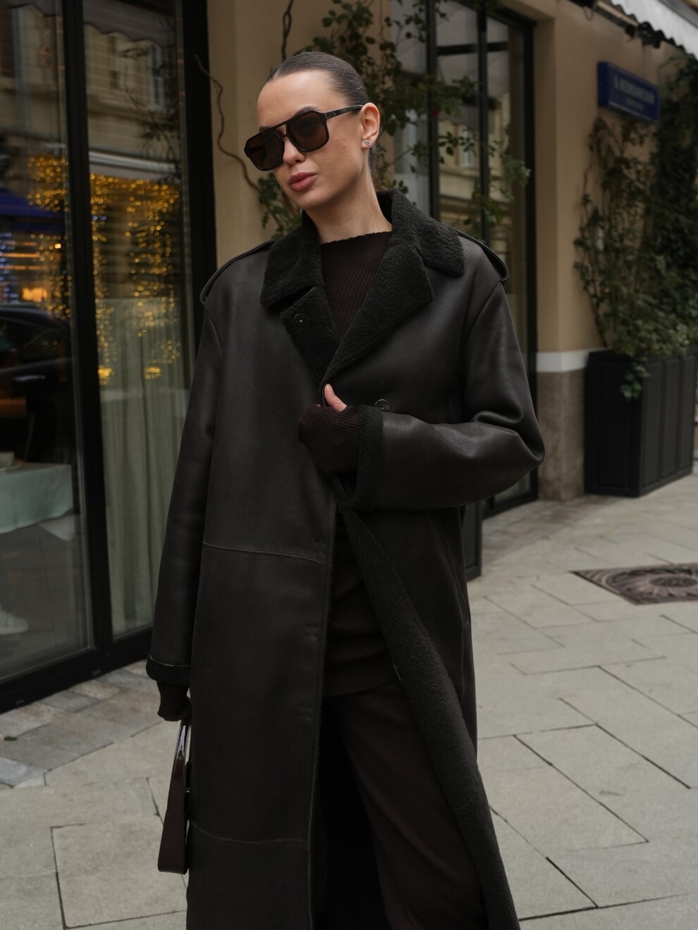 Дублёнка прямого кроя на кнопках длины макси с погонами и карманами из натуральной итальянской овчины Кёрли, без подклада.