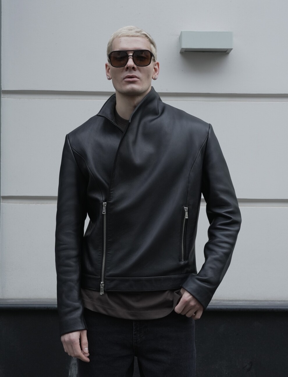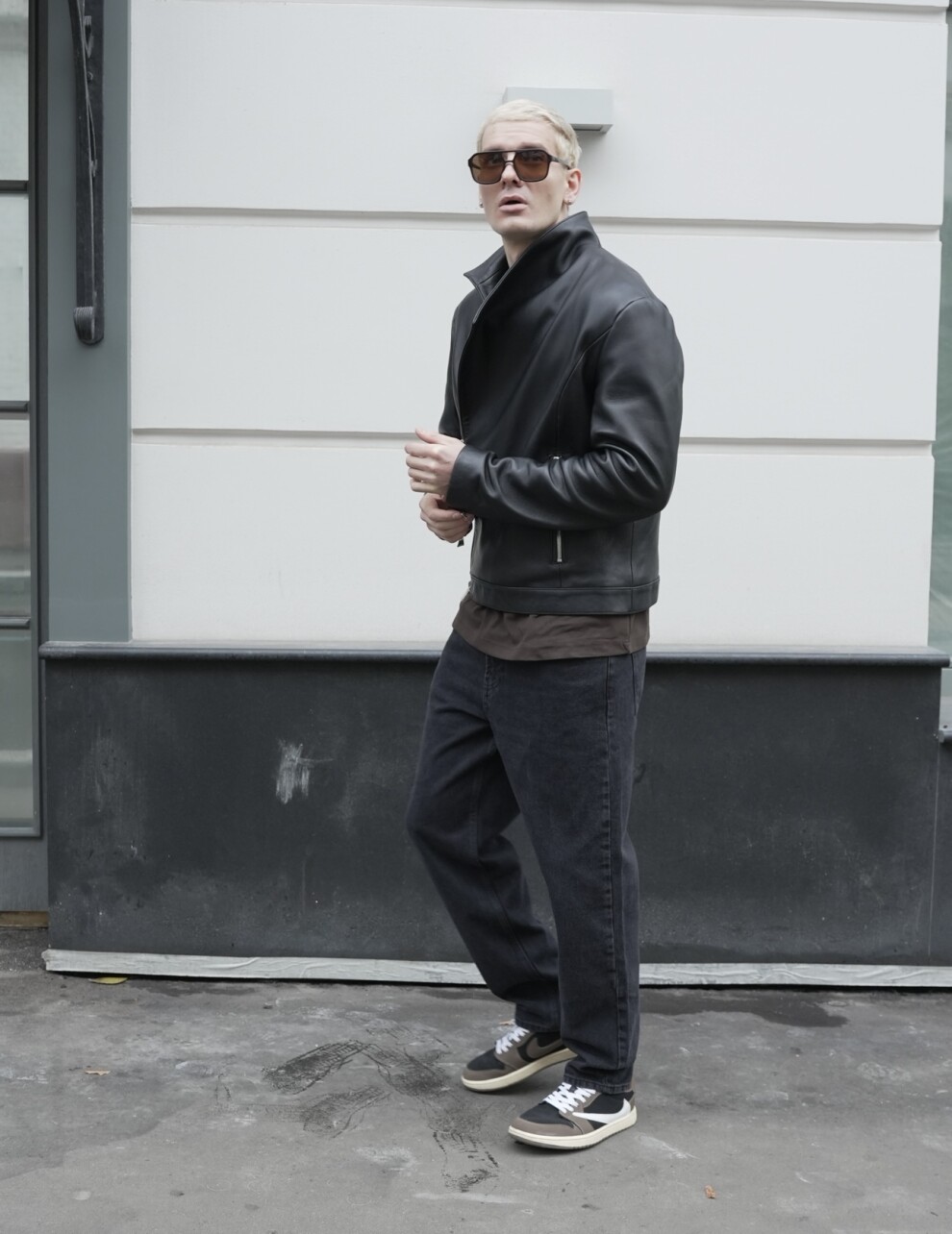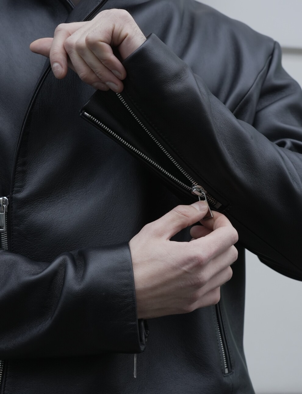 Куртка с акцентным подкладом красного цвета на молнии выполнена из натуральной матовой кожи с одним карманом и воротом стойкой, декор в виде молний на рукавах. Подходит для обоих в паре - модель унисекс.