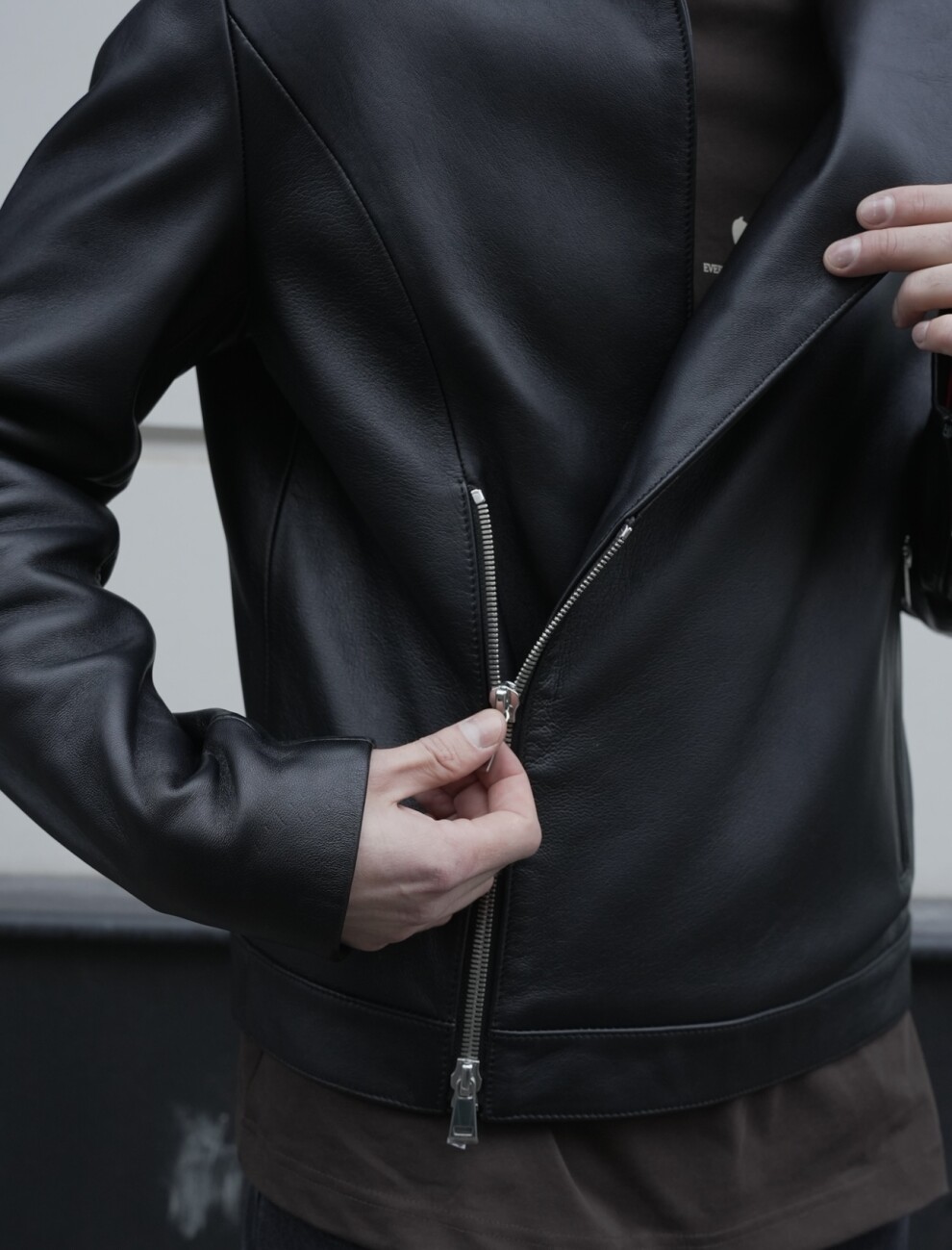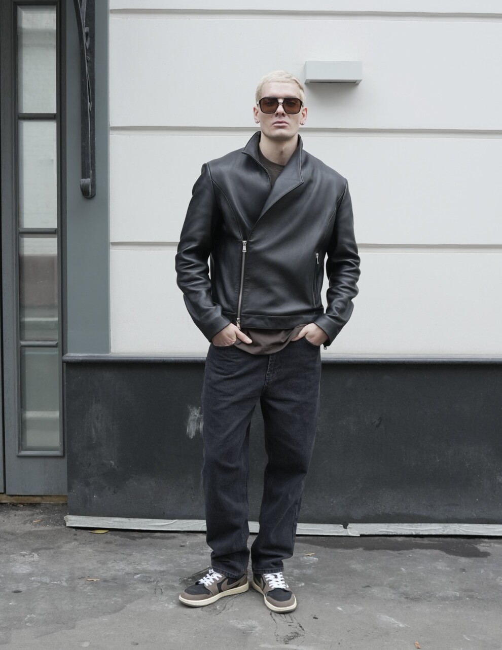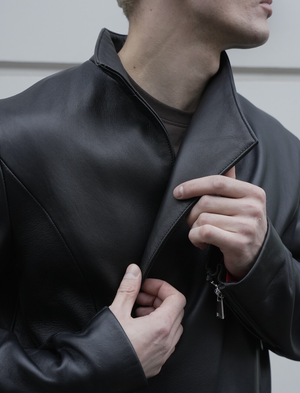 Куртка с акцентным подкладом красного цвета на молнии выполнена из натуральной матовой кожи с одним карманом и воротом стойкой, декор в виде молний на рукавах. Подходит для обоих в паре - модель унисекс.